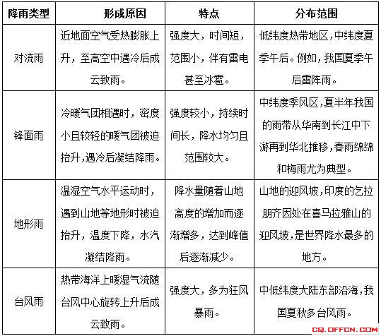 當(dāng)空氣中水汽充足且達(dá)到飽和后,一般就會發(fā)生降雨。降雨只要分為鋒面雨、對流雨、臺風(fēng)雨和地形雨四種類型。下面,將從形成原因,特點以及分布范圍等方面來梳理下四大降雨類型的考點。
