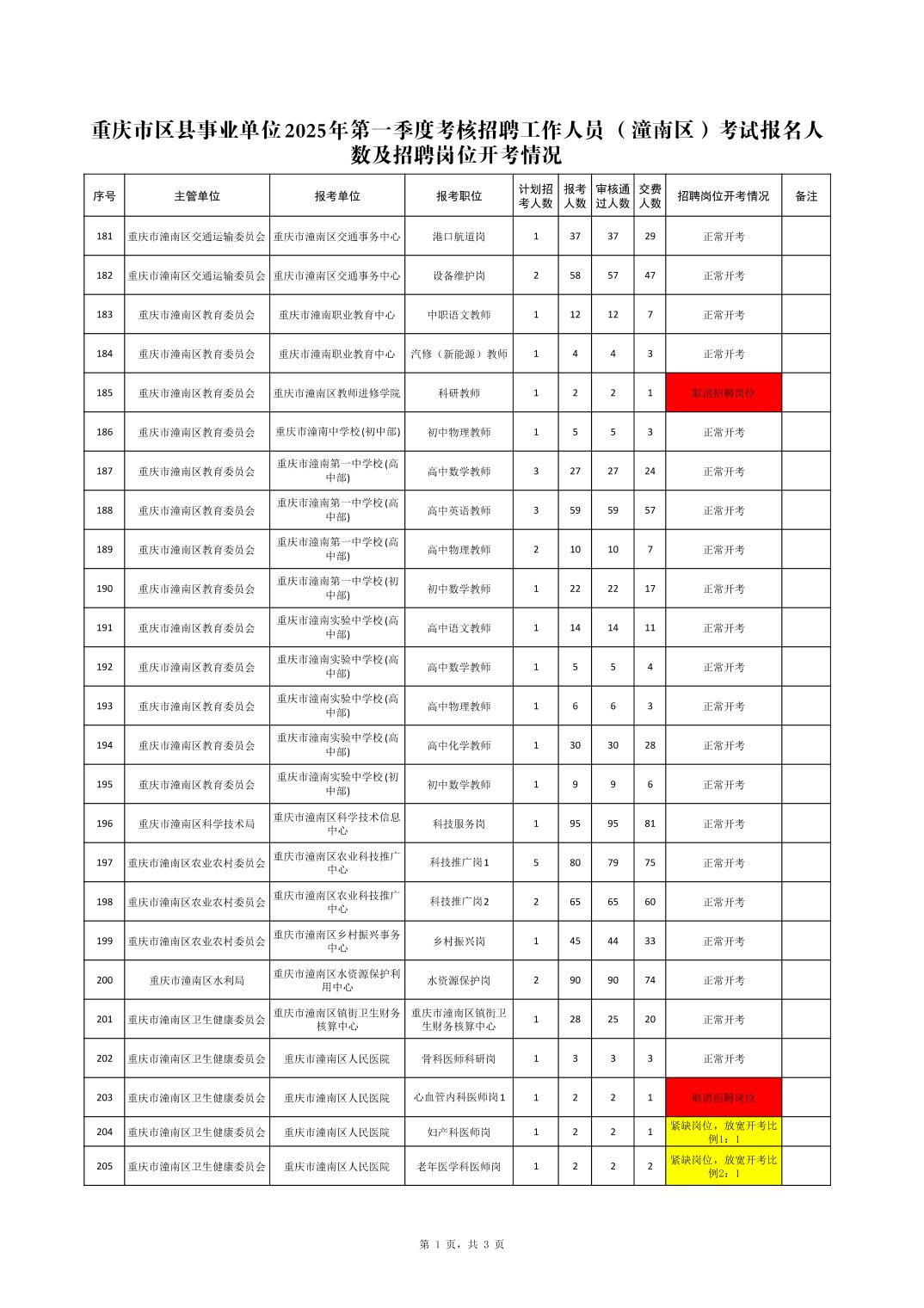 原標(biāo)題:重慶市區(qū)縣事業(yè)單位2025年第一季度考核招聘工作人員(潼南區(qū))考試報(bào)名人數(shù)及招聘崗位開考情況