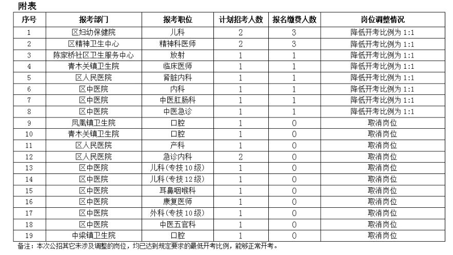 按照2020年9月3日發(fā)布的《沙坪壩區(qū)2020年下半年公開招(選)聘事業(yè)單位工作人員簡(jiǎn)章》中“未達(dá)到筆試開考比例情形的處理”有關(guān)規(guī)定,根據(jù)本次招聘各崗位報(bào)名確認(rèn)情況,崗位需求及人才緊缺程度,經(jīng)有關(guān)用人單位及主管部門研究,并報(bào)市級(jí)事業(yè)單位人事綜合管理部門備案,現(xiàn)對(duì)有關(guān)崗位的招聘名額進(jìn)行調(diào)整(詳見附表)。