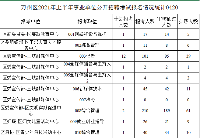 【導(dǎo)語】2021年萬州區(qū)上半年事業(yè)單位公開招聘考試報名統(tǒng)計0420(掛網(wǎng))現(xiàn)已發(fā)布,新公教育 為廣大考生整理此次公告內(nèi)容如下,望各位考生及時查看切勿錯過報名時間。新公教 育為報考重慶事業(yè)單位考生提供備考資料、輔導(dǎo)用書、真題講義、筆試課程等內(nèi)容, 歡迎各位考生加入備考備考QQ群:663261430 一起學(xué)習(xí)!
