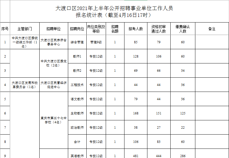 【導(dǎo)語】2021年大渡口區(qū)上半年公開招聘報(bào)名統(tǒng)計(jì)11530人(截至4月16日17時(shí))現(xiàn)已發(fā)布,新公教育 為廣大考生整理此次公告內(nèi)容如下,望各位考生及時(shí)查看切勿錯(cuò)過報(bào)名時(shí)間。新公教 育為報(bào)考重慶事業(yè)單位考生提供備考資料、輔導(dǎo)用書、真題講義、筆試課程等內(nèi)容, 歡迎各位考生加入備考備考QQ群:663261430 一起學(xué)習(xí)!