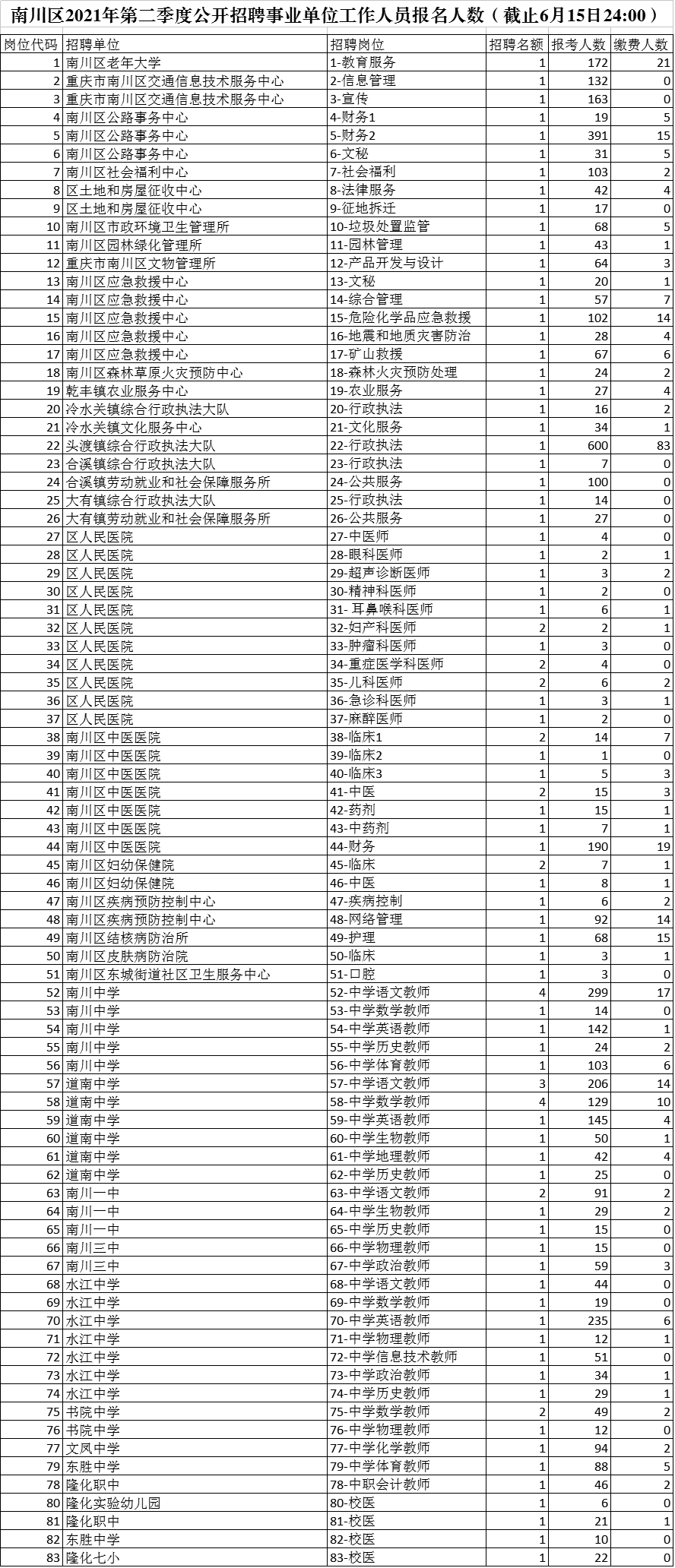 【導(dǎo)語】2021年南川區(qū)公開招聘事業(yè)單位工作人員報(bào)名人數(shù)(截止6月15日24點(diǎn))現(xiàn)已發(fā)布,新公教育 為廣大考生整理此次公告內(nèi)容如下,望各位考生及時(shí)查看切勿錯(cuò)過報(bào)名時(shí)間。新公教 育為報(bào)考重慶事業(yè)單位考生提供備考資料、輔導(dǎo)用書、真題講義、筆試課程等內(nèi)容, 歡迎各位考生加入備考備考QQ群:663261430 一起學(xué)習(xí)!按照《南川區(qū)2021年第二季度公開招聘事業(yè)單位工作人員簡章》和重慶市有關(guān)規(guī)定,現(xiàn)就南川區(qū)2021年第二季度公開招聘事業(yè)單位工作人員報(bào)名人數(shù)(截止6月15日24:00)公布如下: