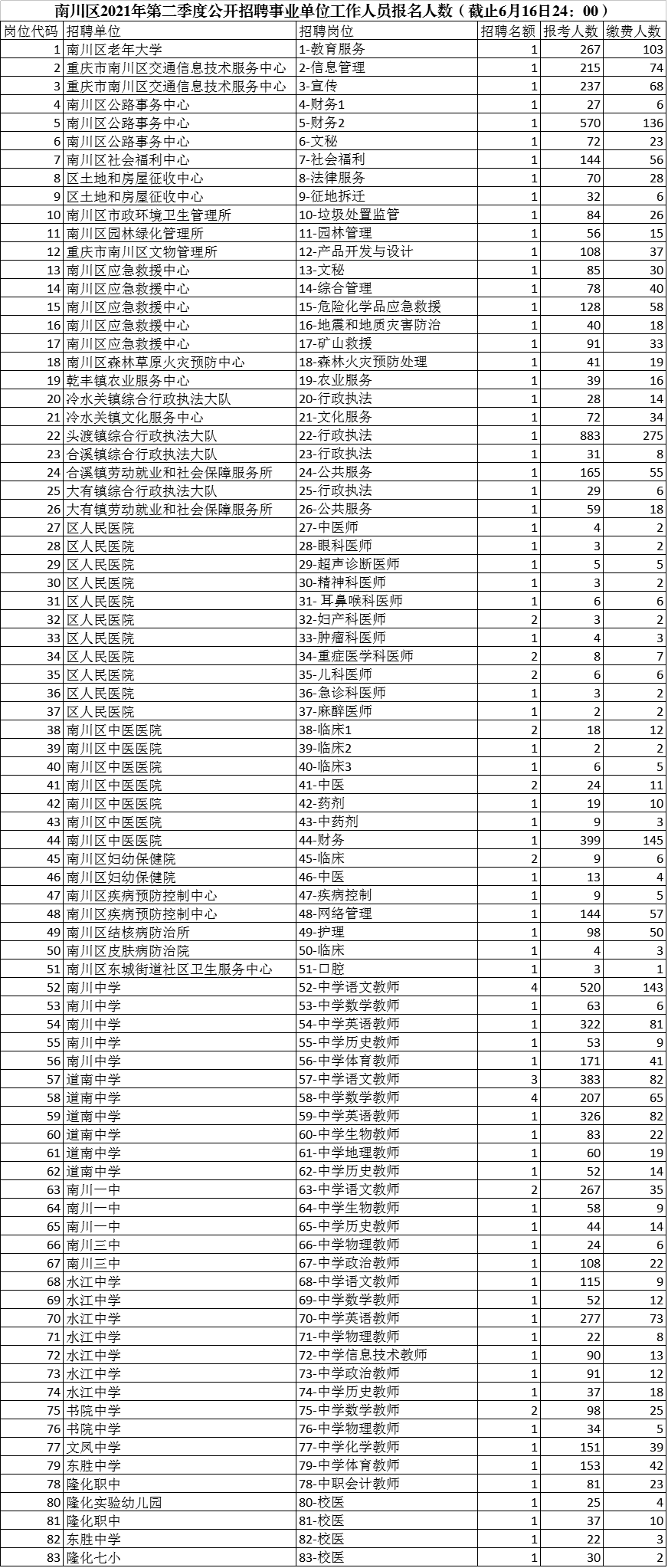 【導語】2021年南川區(qū)第二季度公開招聘事業(yè)單位工作人員報名情況統(tǒng)計0616現(xiàn)已發(fā)布,新公教育 為廣大考生整理此次公告內(nèi)容如下,望各位考生及時查看切勿錯過報名時間。新公教 育為報考重慶事業(yè)單位考生提供備考資料、輔導用書、真題講義、筆試課程等內(nèi)容, 歡迎各位考生加入備考備考QQ群:663261430 一起學習!按照《南川區(qū)2021年第二季度公開招聘事業(yè)單位工作人員簡章》和重慶市有關規(guī)定,現(xiàn)就南川區(qū)2021年第二季度公開招聘事業(yè)單位工作人員報名人數(shù)(截止6月16日24:00)公布如下: