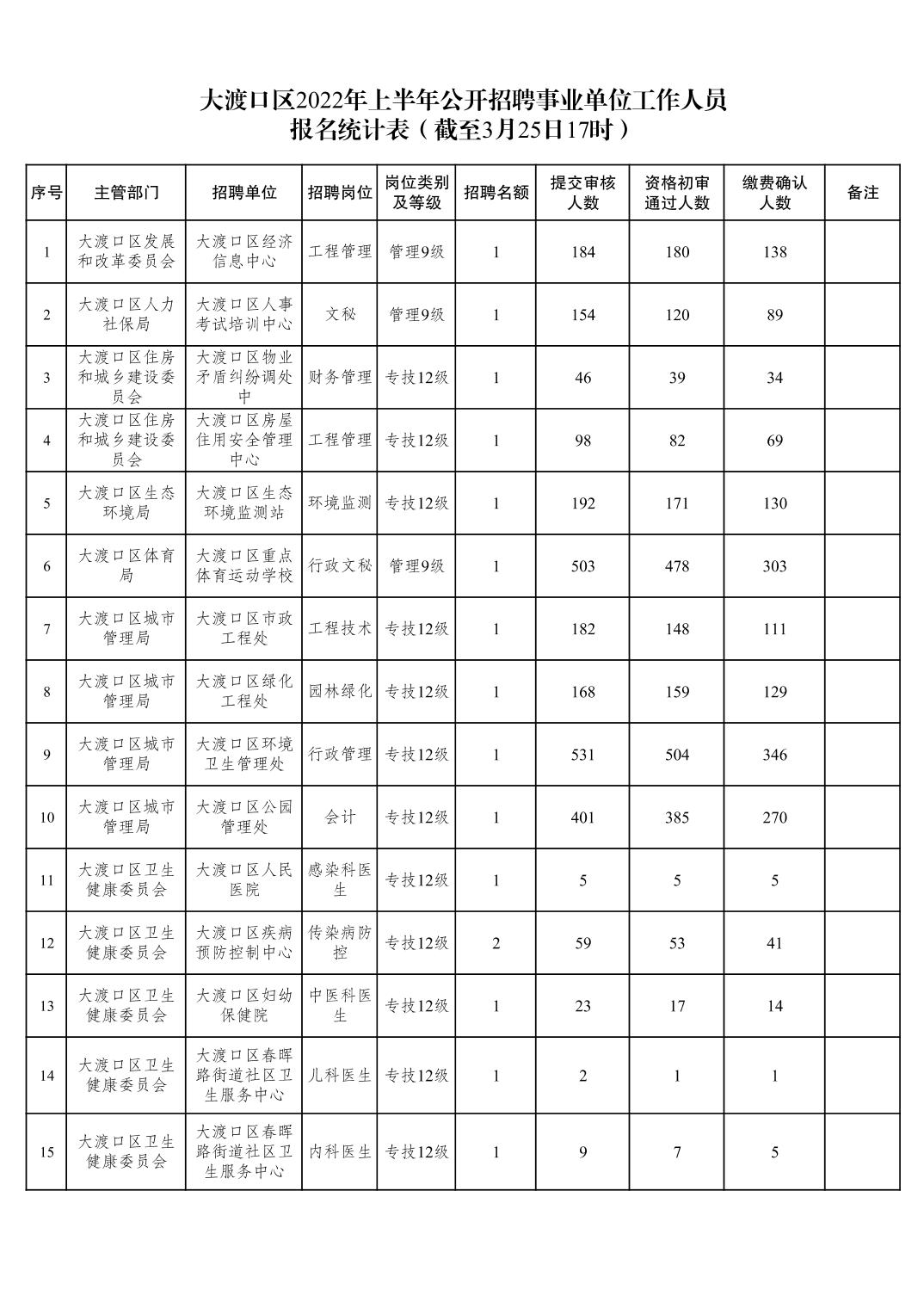 原標(biāo)題:大渡口區(qū)2022年上半年公開招聘事業(yè)單位工作人員報名統(tǒng)計表(截至3月25日17時)