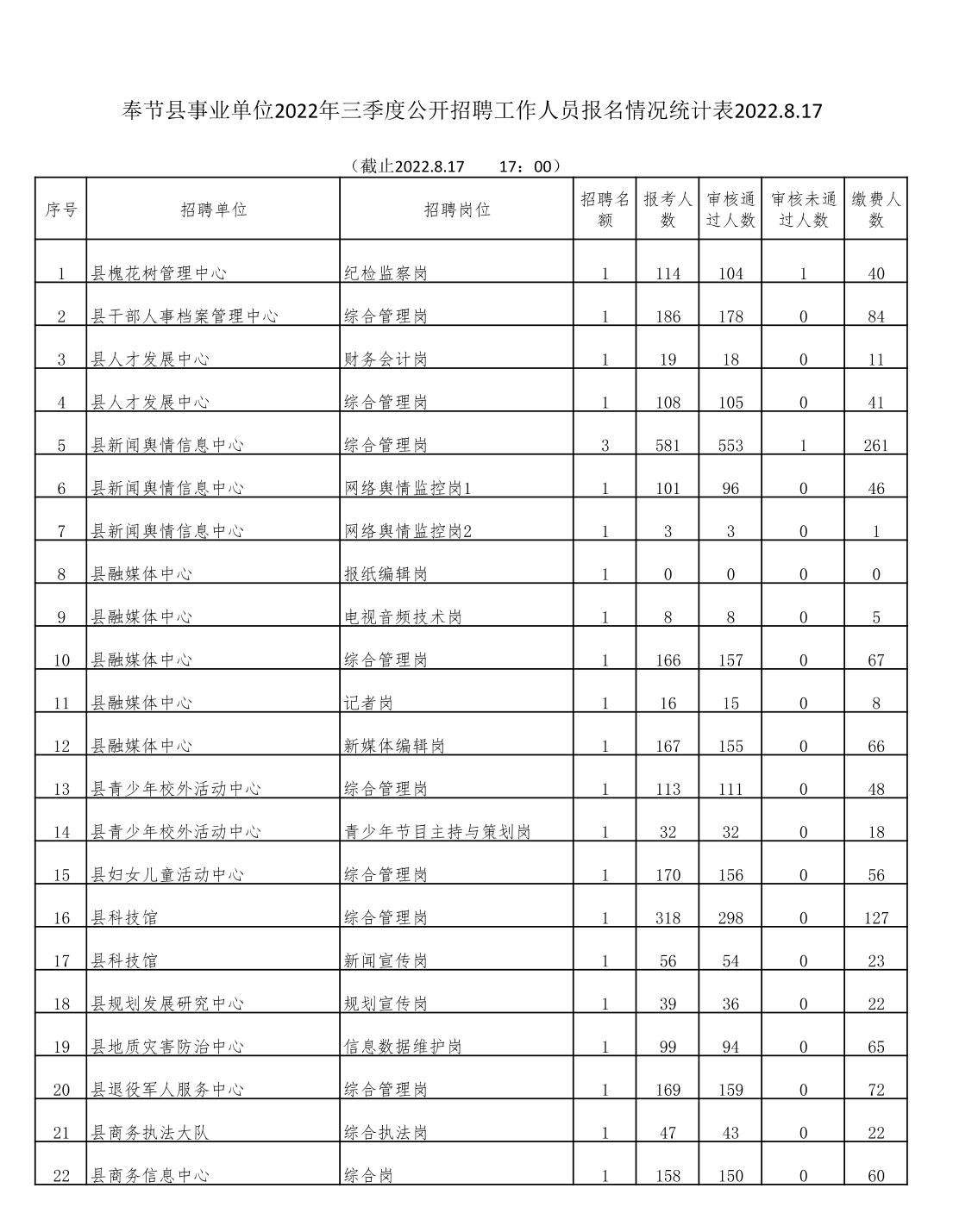 原標題:奉節(jié)縣事業(yè)單位2022年三季度公開招聘工作人員報名情況統(tǒng)計表(8.17)