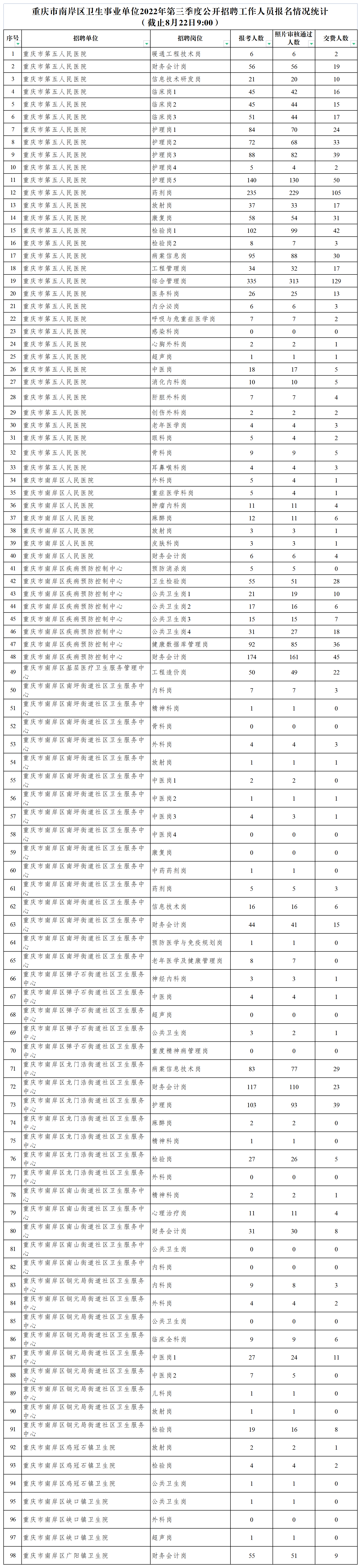 原標(biāo)題:重慶市南岸區(qū)衛(wèi)生事業(yè)單位2022年第三季度公開招聘工作人員報(bào)名情況統(tǒng)計(jì)(8月22日)