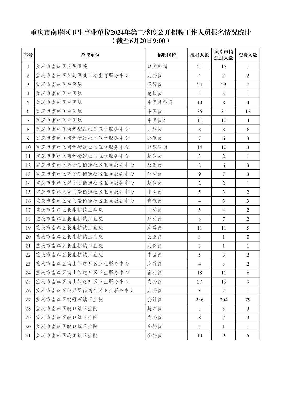 原標(biāo)題:重慶市南岸區(qū)衛(wèi)生事業(yè)單位2024年第二季度公開招聘工作人員報名情況統(tǒng)計(6月20日)
