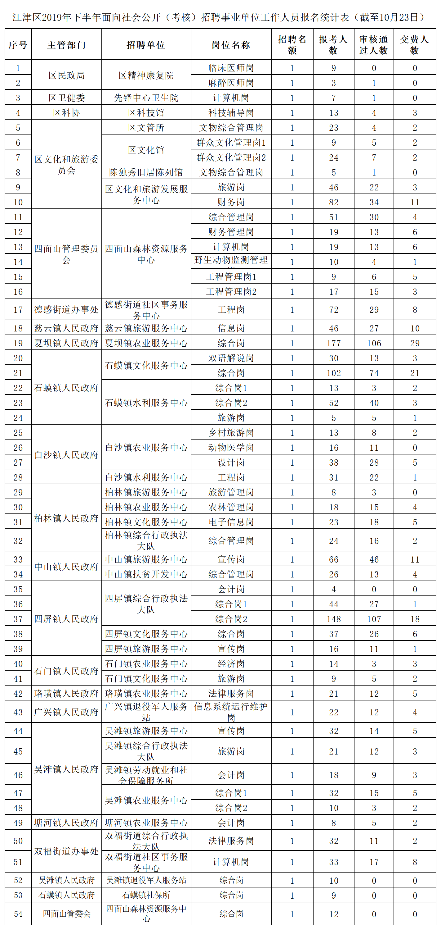 江津區(qū)2019年下半年面向社會(huì)公開(考核)招聘事業(yè)單位工作人員報(bào)名統(tǒng)計(jì)(截至10月23日)