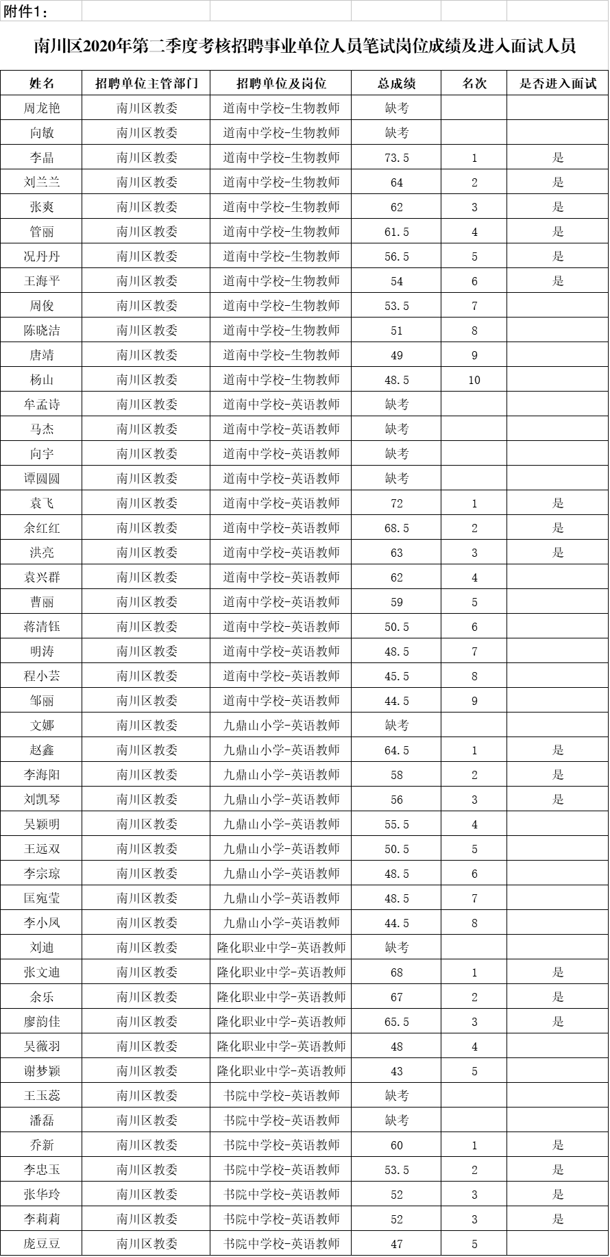 原標(biāo)題:南川區(qū)2020年第二季度考核招聘事業(yè)單位人員筆試成績、進(jìn)入面試環(huán)節(jié)人員及資格復(fù)審相關(guān)安排