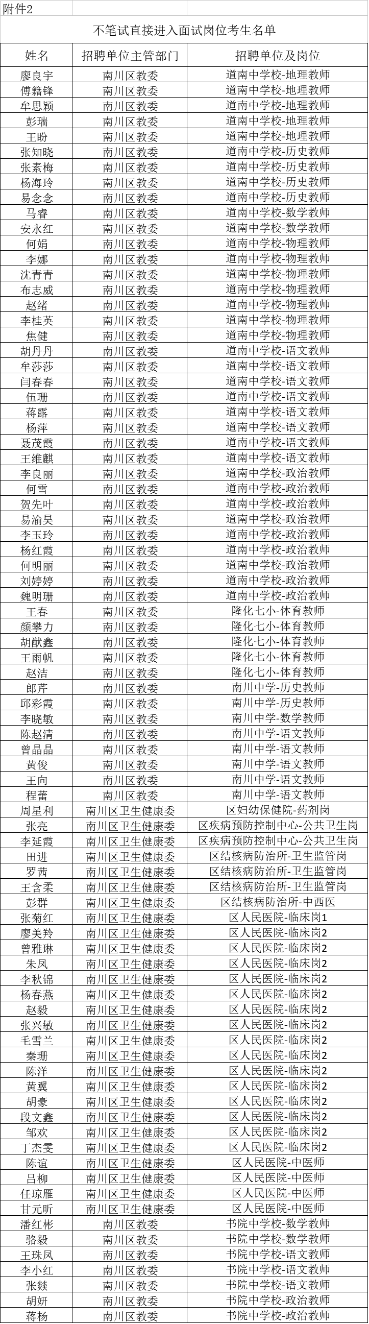 根據(jù)《南川區(qū)2020年二季度考核招聘事業(yè)單位工作人員簡章》規(guī)定,現(xiàn)將筆試成績、進(jìn)入面試環(huán)節(jié)人員名單及資格復(fù)審相關(guān)安排事項告知如下,請應(yīng)試人員按照本須知規(guī)定參加各環(huán)節(jié)。