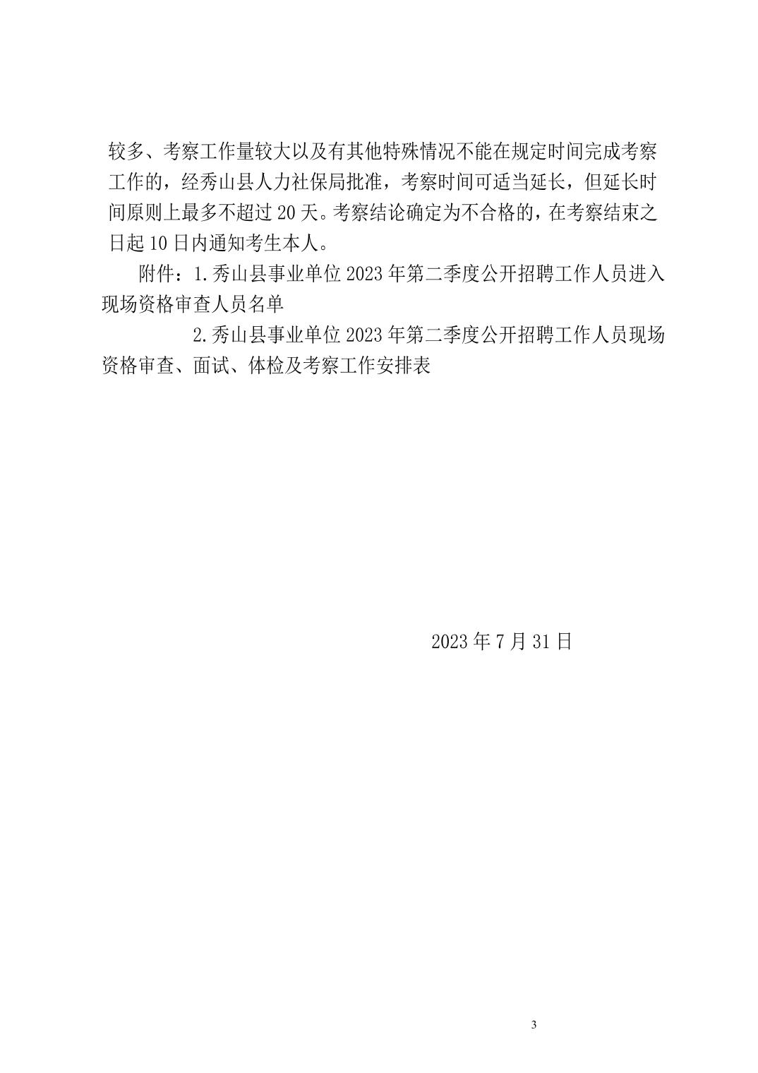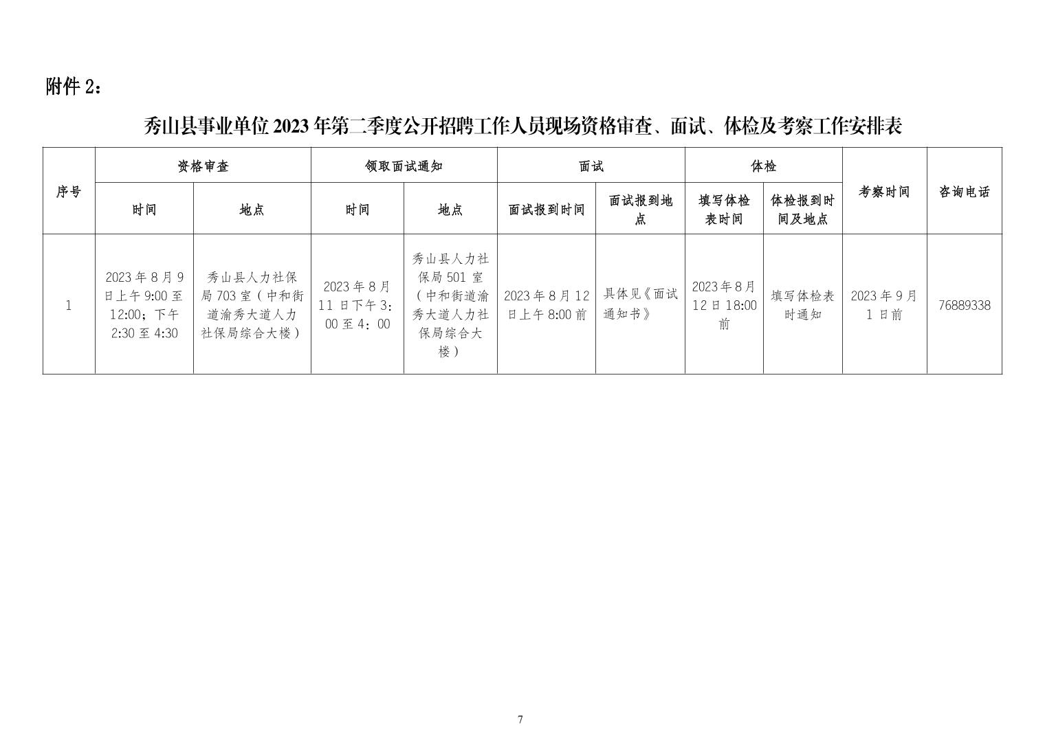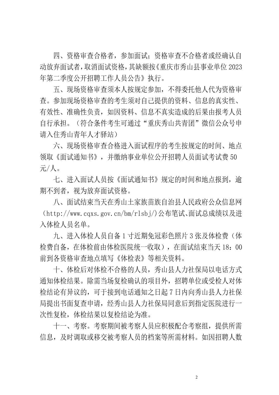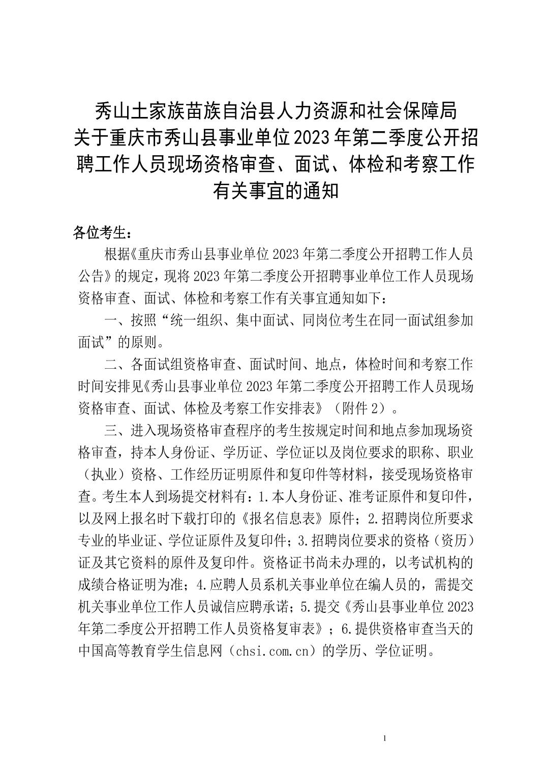 原標(biāo)題:關(guān)于重慶市秀山縣事業(yè)單位2023年第二季度公開招聘工作人員現(xiàn)場資格審查、面試、體檢和考察工作有關(guān)事宜的通知
