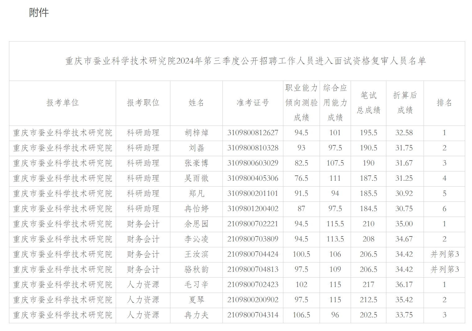 附件:重慶市蠶業(yè)科學(xué)技術(shù)研究院2024年第三季度公開招聘工作人員進(jìn)入面試資格復(fù)審人員名單