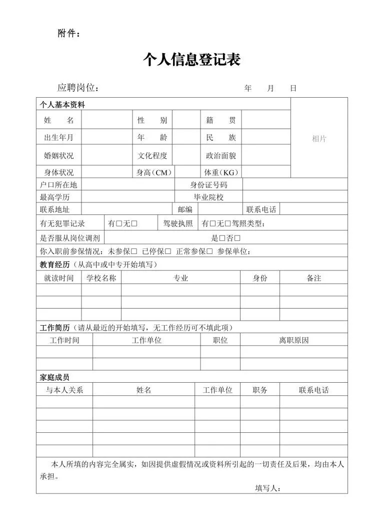3.資格審查所需材料:個(gè)人信息登記表(見(jiàn)附件),本人近期1寸彩色免冠照片5張、身份證原件及復(fù)印件2份、本人戶口簿原件及復(fù)印件1份(主頁(yè)、個(gè)人頁(yè)、增減頁(yè))、畢業(yè)證原件及復(fù)印件1份、本人學(xué)信網(wǎng)學(xué)歷認(rèn)證證明1份、相關(guān)資格認(rèn)證證書(shū)原件和復(fù)印件各1份,個(gè)人征信報(bào)告1份(需攜帶本人身份證前往人民銀行開(kāi)具個(gè)人征信報(bào)告,若個(gè)人征信報(bào)告有較為嚴(yán)重的個(gè)人不良信用記錄,將作不合格處理),退役軍人需出具《退役證》等相關(guān)證明文件。