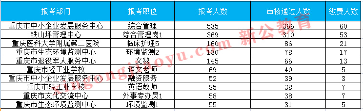 過(guò)審前十的崗位中前五崗位同時(shí)也是報(bào)名人數(shù)最多的前五崗位,排在前兩位的均超過(guò)300人過(guò)審。重慶市中小企業(yè)發(fā)展服務(wù)中心-綜合管理崗位是目前過(guò)審人數(shù)最多的崗位,同時(shí)也是報(bào)名人數(shù)最多的崗位,此崗位僅招考一人,但國(guó)民教育本科以上學(xué)歷即可報(bào),且不限專(zhuān)業(yè),無(wú)政治面貌要求,年齡限制在35周歲以下,因此成為火爆職位。鐵山坪管理中心-綜合管理崗位1要求全日制本科及以上學(xué)位,同時(shí)還要求報(bào)考人員為黨員(含預(yù)備黨員),但此崗位不限專(zhuān)業(yè),屬于市紀(jì)委,招考6人,因此報(bào)考人數(shù)較多。