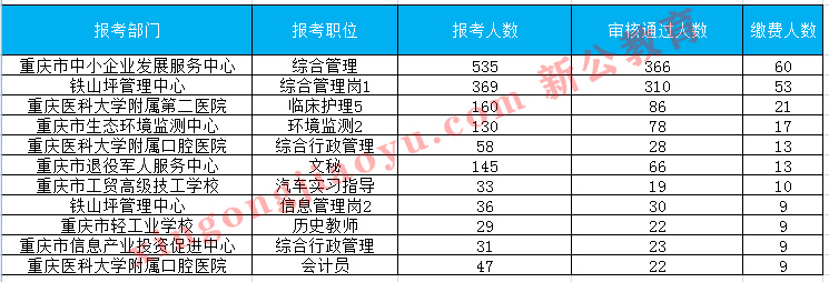 重慶事業(yè)單位考試網(wǎng)為大家整理了本次考試?yán)U費(fèi)人數(shù)最多的前十崗位。目前排在第一的是重慶市中小企業(yè)發(fā)展服務(wù)中心的綜合管理崗。因?yàn)槭菆?bào)名的第一天,即使是排名第一的崗位繳費(fèi)人數(shù)也不算很多,目前只有60人,從第8開(kāi)始,就只有個(gè)位數(shù)的繳費(fèi)人數(shù)了。第一天報(bào)名后還有不少崗位無(wú)人報(bào)考,同學(xué)們可以結(jié)合自身?xiàng)l件,重點(diǎn)關(guān)注一下這些競(jìng)爭(zhēng)壓力比較小的崗位呢。