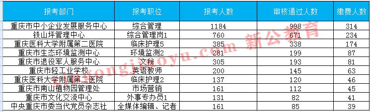 重慶事業(yè)單位考試網(wǎng)為大家整理了本次考試?yán)U費(fèi)人數(shù)最多的前十崗位。目前排在第一的是重慶市中小企業(yè)發(fā)展服務(wù)中心的綜合管理崗,已有314人交費(fèi),但是此崗位僅招考一人,因此競爭壓力較大。報(bào)名時(shí)間已經(jīng)進(jìn)入高峰期了,之前還在觀望的考生也開始陸陸續(xù)續(xù)報(bào)名,但可以看到的是,很多同學(xué)雖然已經(jīng)報(bào)名,也通過了審核,但是并沒有交費(fèi),從第94個(gè)崗位開始,交費(fèi)人數(shù)便為個(gè)位數(shù)了。小編在此溫馨提示,交費(fèi)成功才算報(bào)名成功,已經(jīng)過審的考生盡快交費(fèi),完成報(bào)名。