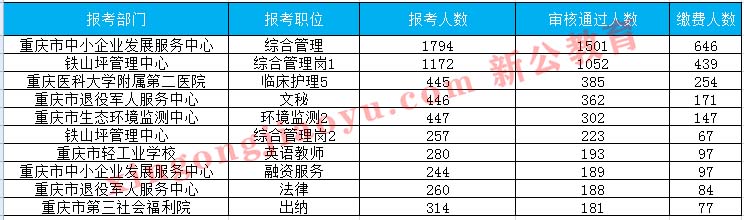過審人數(shù)前兩名的崗位審核通過人數(shù)均超過一千。重慶市中小企業(yè)發(fā)展服務中心-綜合管理崗位是目前過審人數(shù)最多的崗位,同時也是報名人數(shù)最多的崗位,目前已有646人交費。此崗位僅招考一人,但國民教育本科以上學歷即可報,且不限專業(yè),無政治面貌要求,年齡限制在35周歲以下,因此成為火爆職位。鐵山坪管理中心-綜合管理崗位1要求全日制本科及以上學位,同時還要求報考人員為黨員(含預備黨員),但此崗位不限專業(yè),屬于市紀委,招考6人,因此報考人數(shù)較多。