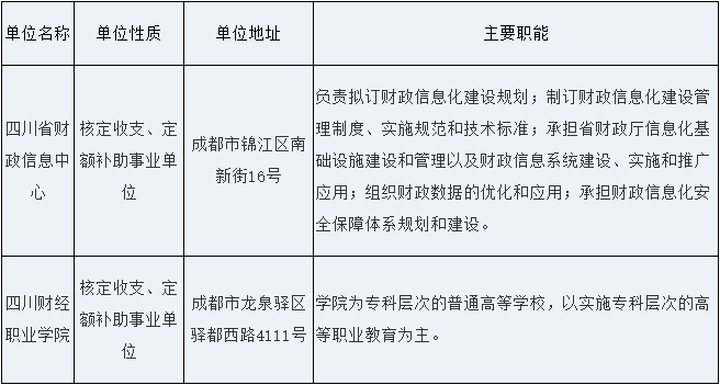 根據(jù)《事業(yè)單位人事管理條例》、《事業(yè)單位公開招聘人員暫行規(guī)定》和《四川省省屬事業(yè)單位公開招聘工作人員實施細(xì)則(試行)》等有關(guān)規(guī)定,省財政廳擬面向社會公開招聘部分工作人員補充到四川省財政信息中心、四川財經(jīng)職業(yè)學(xué)院工作?,F(xiàn)將公開招聘有關(guān)事項公告如下(本公告由省財政廳在四川省人力資源和社會保障廳官網(wǎng)[rst.sc.gov.cn,下同]“人事考試”專欄上發(fā)布)。