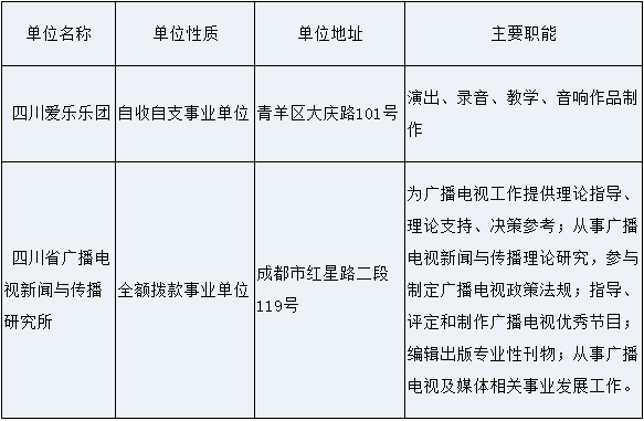 根據(jù)《事業(yè)單位人事管理?xiàng)l例》、《事業(yè)單位公開招聘人員暫行規(guī)定》和《四川省省屬事業(yè)單位公開招聘工作人員實(shí)施細(xì)則(試行)》等有關(guān)規(guī)定,四川廣播電視臺(tái)擬面向社會(huì)公開招聘部分工作人員補(bǔ)充到直屬事業(yè)單位四川愛(ài)樂(lè)樂(lè)團(tuán)、四川省廣播電視新聞與傳播研究所工作?,F(xiàn)將公開招聘有關(guān)事項(xiàng)公告如下(本公告由四川廣播電視臺(tái)同時(shí)在四川省人力資源和社會(huì)保障廳官網(wǎng)[rst.sc. gov.cn,下同]“人事考試”專欄和四川廣播電視臺(tái)網(wǎng)站 [www.sctv.com,下同]上發(fā)布。