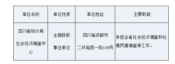 根據(jù)《事業(yè)單位人事管理條例》、《事業(yè)單位公開招聘人員暫行規(guī)定》和《四川省省屬事業(yè)單位公開招聘工作人員實施細則(試行)》等有關(guān)規(guī)定,四川省統(tǒng)計局擬面向社會公開招聘部分工作人員補充到四川省統(tǒng)計局社會經(jīng)濟調(diào)查中心等1個直屬事業(yè)單位工作?,F(xiàn)將公開招聘有關(guān)事項公告如下(本公告由四川省統(tǒng)計局同時在四川省人力資源和社會保障廳官網(wǎng)[rst.sc.gov.cn,下同]“人事考試”專欄和四川統(tǒng)計信息網(wǎng) [http://tjj.sc.gov.cn/,下同]上發(fā)布)。