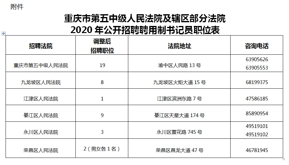按照《重慶市第五中級(jí)人民法院及轄區(qū)部分法院2020年公開(kāi)招聘聘用制書(shū)記員簡(jiǎn)章》,根據(jù)工作需要,經(jīng)研究決定:本次招聘職位由33人調(diào)整為42人,其中,市五中法院調(diào)整為19人,綦江區(qū)法院調(diào)整為9人(調(diào)整后的招聘職位詳見(jiàn)附件)。