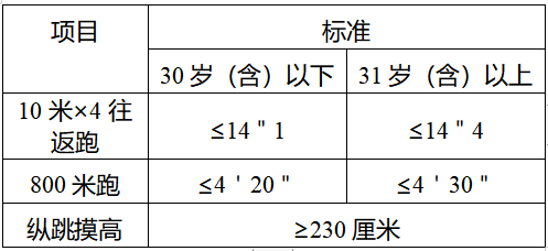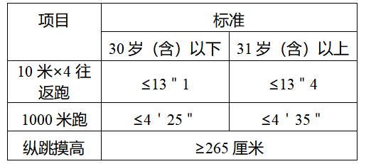 體能測評按《公安機關錄用人民警察體能測評項目和標準》等規(guī)定執(zhí)行。體能測評的3項全部達標的為合格,其中一項不達標的為不合格。體能測評結束的當天公布體能測評結果。體能測評具體內容和標準如下: