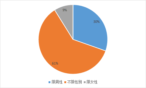 2019年重慶公務(wù)員有68%的崗位不限性別,共招錄806人,占招錄人數(shù)的61%,在性別限制的崗位中,男性崗位有201個(gè),招錄403人,占30%,女性的崗位有66個(gè),招錄118人,占9%,而去年上半年在招錄的所有職位中,限男性的職位一共有196個(gè),共招錄336人,占總招錄人數(shù)的28%。限女性的職位一共有80個(gè),共招錄115人,占總招錄人數(shù)的9%。相比去年來說,今年不限崗位招錄人數(shù)增加64人,限男性招錄人數(shù)增加67人,限女性招錄增加3人。