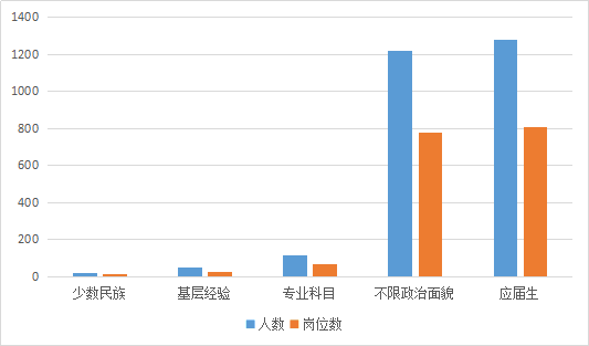 不限政治面貌的崗位有777發(fā)個(gè),招錄人數(shù)有1218人,占總招錄人數(shù)的91.8%,而去年不限政治面貌的職位一共833個(gè),共招錄1156人,不限政治面貌的崗位減少,但是招錄人數(shù)增加。在所有崗位中,超過96%的崗位應(yīng)屆生可報(bào),共招錄1279人,與去年相比,崗位占比數(shù)降低,但招錄人數(shù)增多。