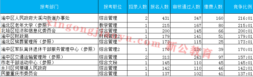 截至26日14:00,昨日競(jìng)爭(zhēng)比最高的渝北區(qū)老年大學(xué)(參照)一職被渝中區(qū)人民政府大溪溝街道辦事處超過,招錄2人,報(bào)名人數(shù)為431人,競(jìng)爭(zhēng)比例達(dá)216:1。