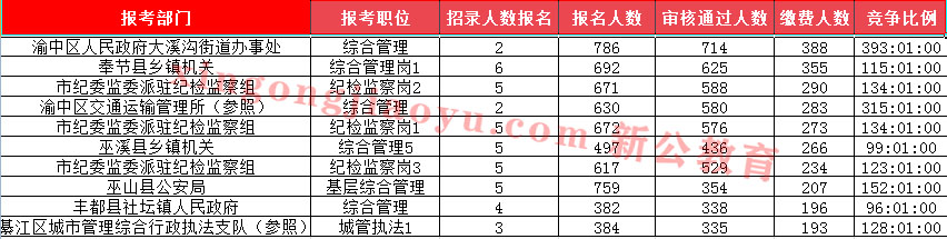 3月28日,2019重慶公務員考試報名進入第五天,據重慶新公教育統(tǒng)計,重慶市考職位通過審核總人數(shù)為49404人,繳費人數(shù)24072人。平均 競爭比例為43:1。重慶新公教育提醒考生,報名時間截止到3月29日18:00。