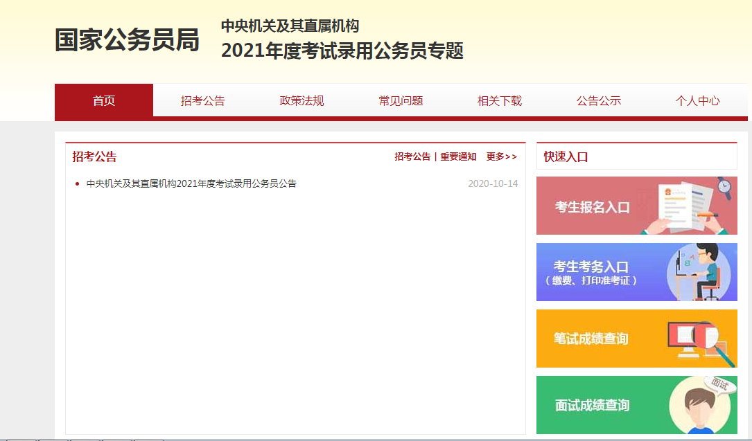 【導(dǎo)語】2021年國家公務(wù)員考試報(bào)名入口現(xiàn)已發(fā)布,新公教育 為廣大考生整理此次公告內(nèi)容如下,望各位考生及時(shí)查看切勿錯(cuò)過報(bào)名時(shí)間。新公教 育為報(bào)考重慶事業(yè)單位考生提供備考資料、輔導(dǎo)用書、真題講義、筆試課程等內(nèi)容, 歡迎各位考生加入備考QQ群 931762566一起學(xué)習(xí)!