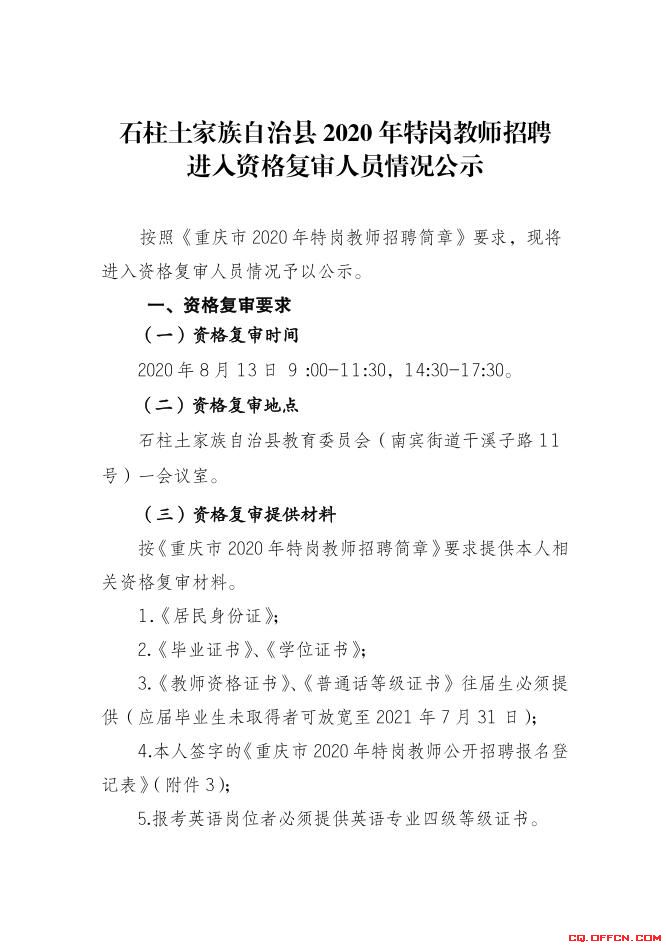 點擊下載>>>2020重慶石柱特崗教師招聘資格復(fù)審名單
