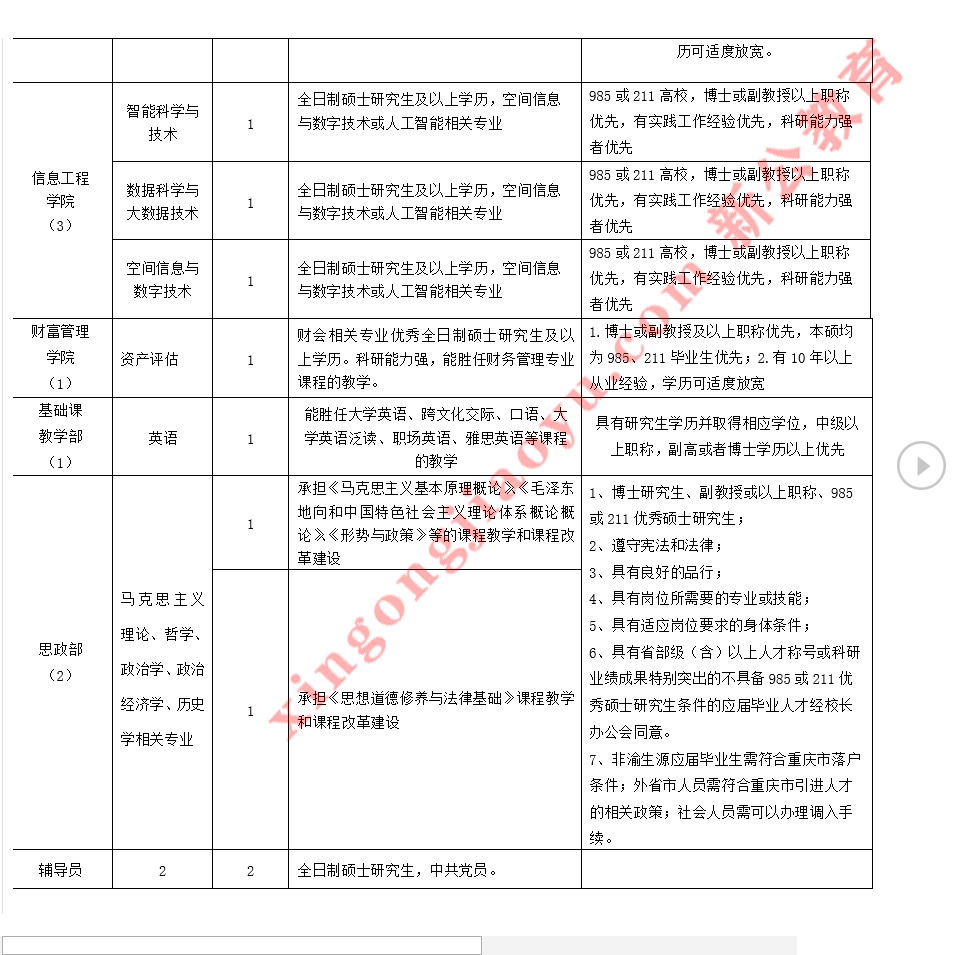 重慶工商大學(xué)融智學(xué)院2018-2019年度人才需求計(jì)劃表