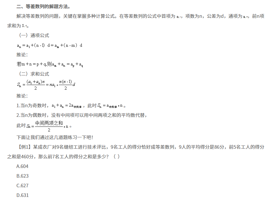 【解析】根據(jù)題意9個(gè)人平均得分為86分,且得分恰好構(gòu)成等差數(shù)列,所以中項(xiàng)a5=86。前5名工人的得分之和是460分,所以前5人的中項(xiàng)a3=460÷5=92。a4=(a3+a5)÷2=(86+92)÷2=89,而前7名工人得分之和=a4×7=89×7=623分。故本題答案為B項(xiàng)。