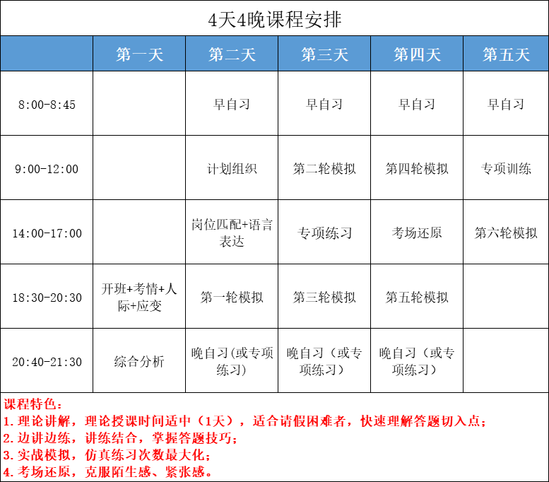 為此,新公教育面試輔導(dǎo)課程火熱上線,為進面的同學(xué)準(zhǔn)備了優(yōu)質(zhì)課程及講師,將于2020年5月11日晚18:00正式開課,為期4天4晚(包住宿)。以下為課程詳情: