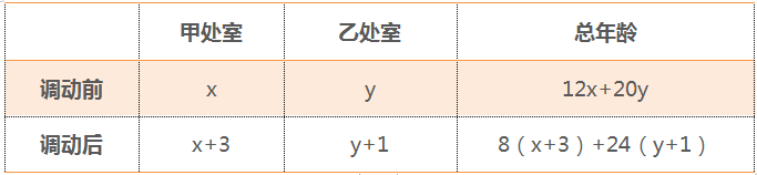 解題思路:題目涉及2個處室,2個階段(調(diào)動前后),情況復(fù)雜,不好理解,列表分析。設(shè)調(diào)動前甲乙處室平均年齡分別為x,y。調(diào)動后甲乙處室人數(shù)分別為8和24,此時平均年齡分別為x+3,y+1。