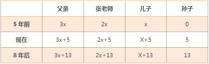 解題思路:題目涉及四個人,3個時間點(5年前,現(xiàn)在,8年后),情況復(fù)雜,列表分析。設(shè)5年前,兒子年齡為x,則5年前張老師父親的年齡為3x,由于每兩代人的年齡差相同,則5年前張老師年齡為2x,孫子年齡為0。