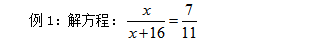 等式左邊有未知數(shù)x的上下的比例關(guān)系,右邊是7和11的比值,那么7和11如果當(dāng)作比例來看的話,比例可以當(dāng)作份數(shù)思想來看,也就是7份和11份,x對應(yīng)的就是7份,x+16對應(yīng)的就是11份,而左邊x和x+16相差了16的具體數(shù)值,右邊差了4份,那么4份就對應(yīng)16的具體值,1份就對應(yīng)4的數(shù)值,x在其中對應(yīng)的是7份,也就是28,這樣x的值也就求解出來了。通過比例的思想,我們可以省去了解方程的過程,因此這樣的方法還是很好用的,那么大家是否能夠靈活運用我們的比例關(guān)系求解呢?來再看下一道題目。