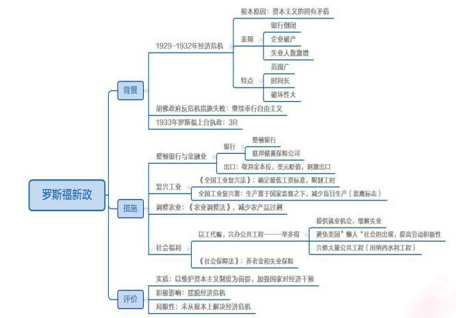(2)努力:包括救濟、復(fù)興和改革三個方面。具體項目有:整頓銀行與金融業(yè)、調(diào)整農(nóng)業(yè)政策、復(fù)興工業(yè)、社會救濟與公共工程等。